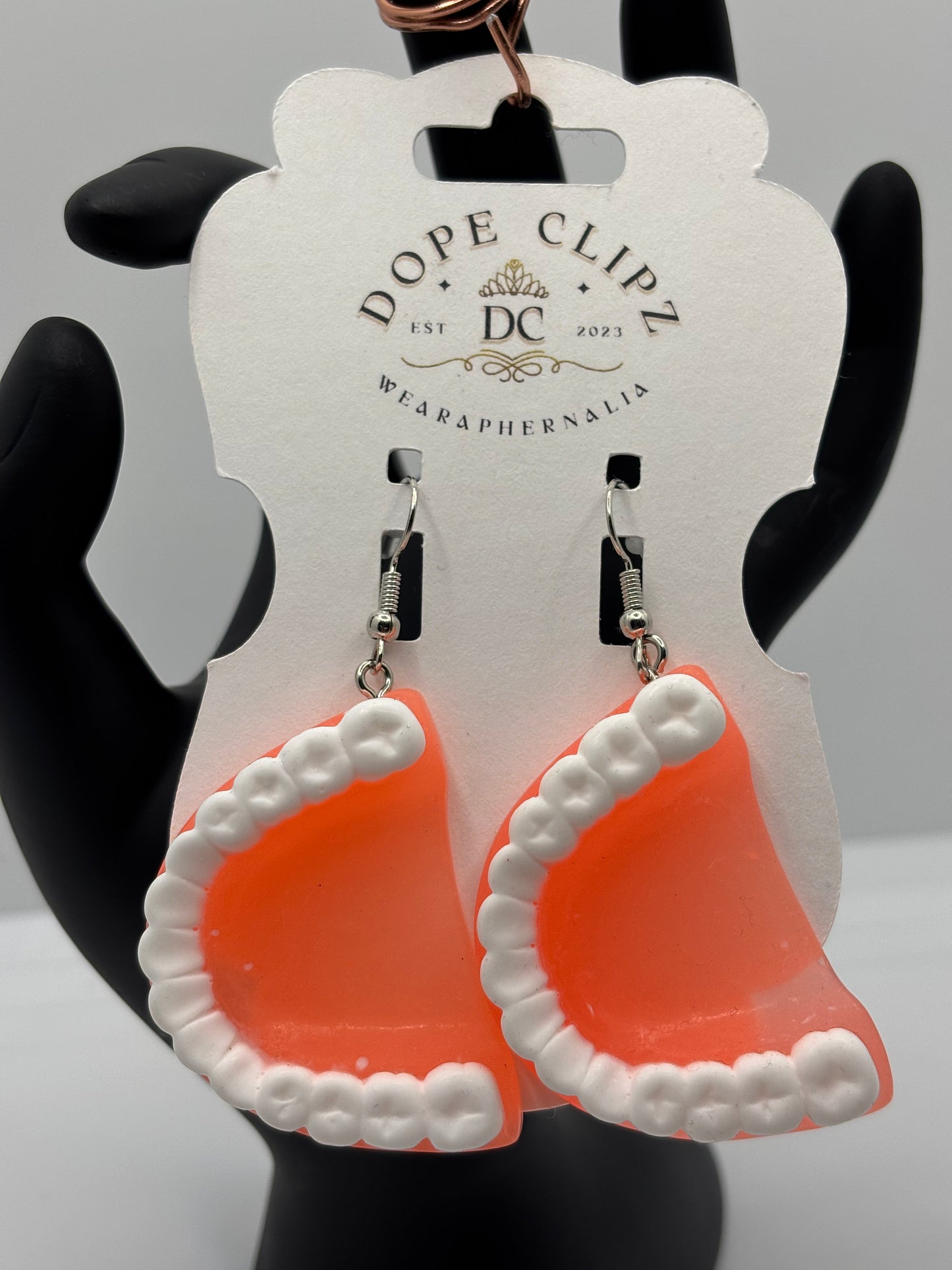 Sink your teeth into this pair of outrageous, unapologetic ear candy — the Chomp Charm Drops. Featuring bright, bold pink resin “denture” charms with perfect little teeth molded in all their glory.